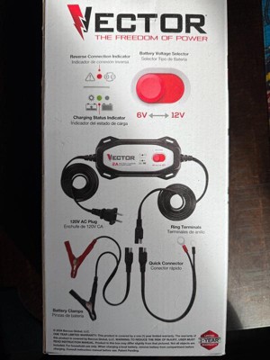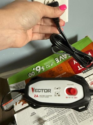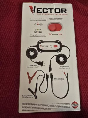 [This review was collected as part of a promotion.] VECTOR 2 AMP Battery Charger and Maintainer allows us to charge and maintain our 6V and 12V batteries eith quick comnect and 12' reach. This battery charger is ideal for any 6 V or 12V battery. We have used it on our motorcycle, 4-wheeler and even electric vehicles. It comes with a limited one year warranty. The design of this charger is easily switched from 6V to 12V via the red battery voltage selector on the face of the product. I really like that it is equipped with a charging status indication light. This helps to know when charging and fully charged. The metal quick connectors allow for an easier switch between battery clamps and ring teminals for seamless adaptability in different charging situations. This unit, automatically compensates for low voltage caused by extension cords or other factors, ensuring consistent and efficient charging for batteries.