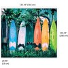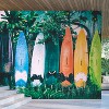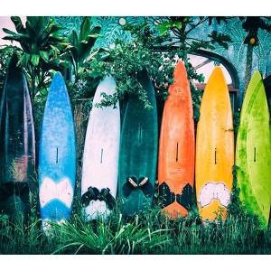 Our Surf Shack Vibes wallpaper mural captures the essence of laid-back coastal living with a vibrant display of well-loved surfboards leaning against a lush tropical backdrop. Weathered from the waves and sun, each board tells a story, creating a mural full of color, texture, and effortless beachside charm. The rich, saturated tones contrast beautifully with the surrounding greenery, making this design a dynamic focal point for any space. Printed on a roll of 6 continuously printed panels, this mural creates an immersive experience. Crafted on a premium, eco-friendly, open-faced non-woven material, it features a rich matte finish that enhances the depth and details of the design. The high-quality backing ensures easy installation with a smooth, strip-to-strip match, and when it's time for a refresh, it peels away in full strips for a hassle-free transformation. Perfect for surf lovers, coastal interiors, or anyone looking to bring a touch of tropical adventure indoors.