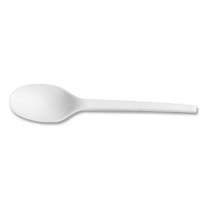 An impressive plant-based utensil with a measurement of 6.5 inches long. Great for hot or cold, and sturdy and strong enough to set into crunchy meals. Made from CPLA, a renewable material made from plants. White color, matte finish. Award-winning quality by Vegware, made from plants. Designed for industrial composting. BPI Certified Compostable