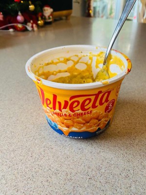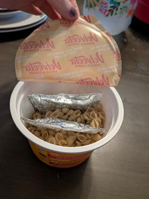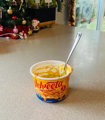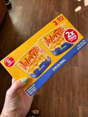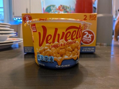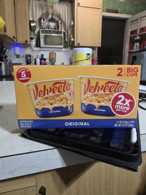 - Two 5 oz cups of Velveeta Shells & Cheese Original Microwaveable Shell Pasta & Cheese Sauce Big Cups