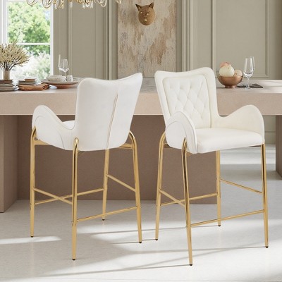 Velvet 28.75" Counter Height Bar Stools with Tufted Back, Arms, Footrest, and Metal Legs, Set of 2