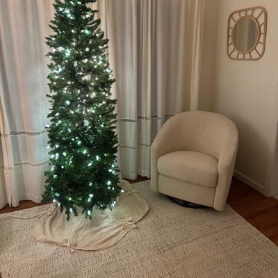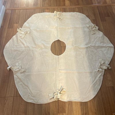 [This review was collected as part of a promotion.] I paid full price for this tree skirt and I expected better quality. The fabric is thinned than I expected. I suggest that you wait until this goes on sale to get a better price if you like it. The bows are super cute and add a touch of feminine flair to your Christmas decor. The cream color is soft an beautiful. The scalloped edge is unique. I was happy with the feel of the fabric to the touch.