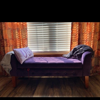 Purple is my favorite color and for many years I've been searching for an affordable storage bench in this exact color. The fabric is soft, the bench is sturdy, and the color is a rich, deep violet. It fits perfectly under my window and I've been using it for reading. One of the side arms was difficult to attach to the bench, we think because the fastener holes were misaligned, but other than that not too bad.