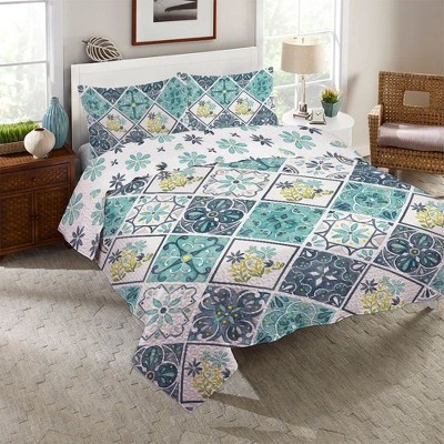 The Venetia quilt set by Laura Ashley reflects a modern interpretation of a classic graphic damask design, made calming by a neutral blue and gray tones. Sophisticated and elegant, this ensemble will add a decorator look to your bedroom. Reverses to a smaller scale lattice scroll pattern. Prewashed for softness, this 100% cotton quilt set becomes cozier with each wash. Filled with a blend of 80% cotton/20% poly it is light weight yet can be layered for year-round use. Set includes one quilt and two shams for full/queen and king size, one sham for twin size. Machine washable for easy care.
