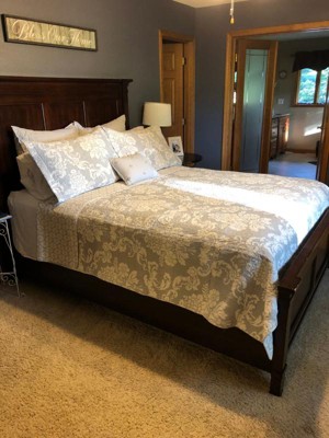 This quilt is beautiful and fits our queen size bed nicely. Since the colors are light grey and white, the print is inviting and not too bold. It is a classic look. The quality seems good, the quilt is light (not heavy), and the reverse print is also nice.