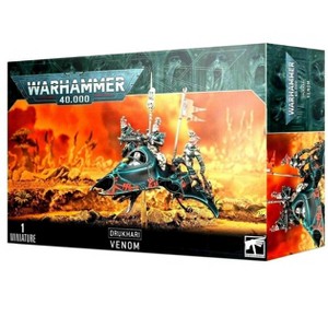This multi-part plastic kit contains one Drukhari Venom in 62 components. The kit includes two Wyches that represent a unit being transported into battle, a third Wych firing the on-board splinter cannon and a clear plastic canopy, giving you the option to paint the pilot and still be able to see him once the kit is fully assembled. It is also supplied with a ball and socket flying stand and a large flying base. This miniature is supplied unpainted and requires assembly.War Battle Games