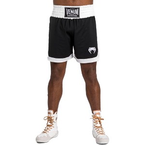 With a little twist on the traditional, the Venum Classic Boxing Shorts are designed for athletes and practitioners of the art of boxing. These lightweight boxing shorts feature a traditional wide waistband for a secure fit so you can focus on your performance in the ring. Flexible fabric and side slits facilitate full range of mobility. Duck and weave in comfort with these loose-fit breathable shorts designed for your comfort. Embroidered Venum logos are featured at the front and back of the waistband as well as the left thigh. Pair these boxing shorts with your favorite Venum gloves for a complete look during sparring and competition. Features: Made from a durable polyester/elastane blend. Traditional wide waist belt for greater support. Lightweight and flexible material. Ideal for all skill levels. Silk-screened Venum logo. Machine washable; Do not tumble dry, iron, or bleach.