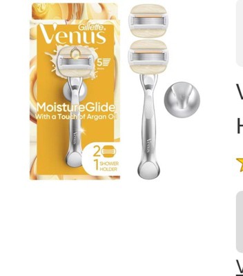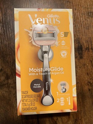 Don't compromise your dry skin with just any old razor blade. Give it the love it deserves with the Gillette Venus Moistureglide Razor Blades for women. Designed specifically to care for even the driest skin, these Venus Moistureglide razor blade refills are dermatologically accredited, so you can get a worry-free, hydrating smooth that lasts. The 2-in-1 moisture bars, made with a touch of argan oil, both lathers and shaves in one stroke-no shave cream required! These 5-blade razor blades have a lubricating strip which glides over skin to help protect from shave irritation and each razor refill lasts up to 30 days based on 2x/week shave. Did you know that any Venus blade refill fits any Venus refillable handle*? Venus refillable handles are designed to last so you only need to change your blades. Get a razor that gets your dry skin. Get Venus Moistureglide. Looking for even more ways to love your skin, your way? Gillette Venus products are made with your body and hair in mind, wherever you want to trim, shave, shape, or style. Explore the entire range of Venus products, from razors and blades to shave gels, disposables, pubic razors, and more. *Except Simply Venus and Venus for Pubic Hair and Skin