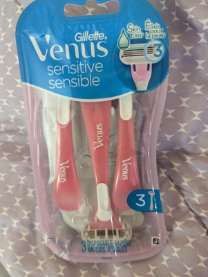 Venus female razor blades are designed with a woman's body in mind. Venus Sensitive women's razors are made for women with sensitive skin. These women's disposable razors feature 3 curve-hugging blades for a shave with up to 0% irritation* and cut hair closer to the skin, for a shave that keeps your skin protected. *US Consumer Study, Feb. 2018. Designed with a soft-grip gel handle and 3 blades for a close and comfortable shave.