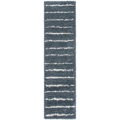 Elevate your space with this elegant runner that offers a touch of sophistication. Measuring 2 feet 2 inches by 6 feet, its ideal dimensions make it a perfect addition to any hallway or entryway. The grey and ivory hues blend beautifully, creating a chic striped pattern that complements a variety of decors. Its shag Flokati style adds a layer of comfort and visual appeal. Crafted in Egypt using the power loomed technique, this rug combines 61 percent polypropylene, 24 percent jute, 7 percent polyester, and 8 percent latex for a unique texture and finish. With a height of 1 and 3/4 inches, it provides a soft and inviting surface underfoot. Enhance your home with this versatile and stylish rug.