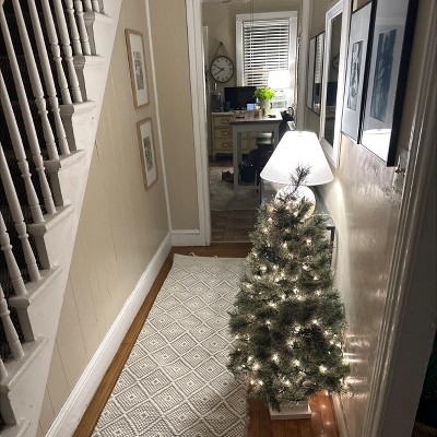 Tassels are a lot more sparse than shown in the online pics, one tassel is missing on the end of this 8 ft runner. Measurements are accurate, minimal smell. We had this exact same rug in our bedroom, about eight years ago, purchased from another vendor but same exact rug. This runner has minimal smell and a nice cotton backing. Kind of flimsy, but not super thin, like a washable rug. The ivory definitely has a hint of yellow to it, almost beige, not bright white like the picture online, but I knew that coming into it and also from the product description as “ivory.” It pulls a warmer color of ivory in this space. Believe it or not, this rug does hold up very well over time. It did not show lots of signs of wear when it was in our bedroom but now it is in our hallway that leads to the playroom so it will inevitably show more wear in this location. I’m honestly disappointed in the yellowish color and the tassels, but I’ll probably keep it anyway as it was $55 and it’s wool and seemingly well made. I’ve finally learned my lesson, with kids in the home, not to buy bright white rugs even though they are beautiful, whether they’re washable or not, because they don’t stay bright white no matter what we do!