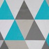 - Features a triangular geometric pattern with varying shades of blue and grey