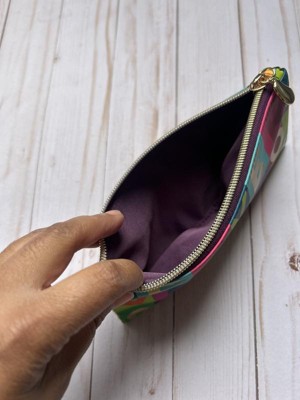 This pencil pouch is vibrant and colorful. It has a soft padded feel on the outer portion and is a good size to hold many Items. It is versatile and can be used as an on the go makeup pouch as well. purposes. The gold avocado shaped zipper pull is a cute touch.
