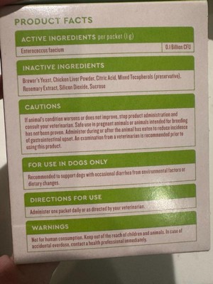 active ingredients per packet (1 g): enterococcus faecium - 0.1 billion cfu. inactive ingredients: brewer's yeast, chicken liver powder, citric acid, mixed tocopherols (preservative), rosemary extract, silicon dioxide, sucrose.
