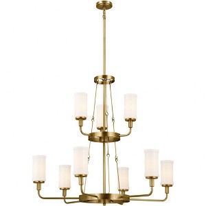 Collection: Vetivene, Material: Steel, Finish Color: Natural Brass, Width: 39.75", Height: 37.25", Length: 39.75", Lamping Type: Incandescent, Number Of Bulbs: 9, Wattage: 60 Watts, Moisture Rating: Dry Rated, Desc: Inspired by vintage herbal drying racks, Vetivene 9 light chandelier's decorative hooks make the old new again. Its Textured Black finish cleanly contrasts with its Opal Glass shades. It includes multiple stems to adjust its height and an extra set of candle sleeves, so you can display it without the shades. Embracing the warmth and comfort of vintage style, Vetivene is refreshing and versatile A rich Black finish with a subtle surface texture that creates dimension as it effortlessly complements various design styles Optional Opal Glass shades mimic Depression-era milk glass to illuminate in nostalgic beauty Fixture measures 39.8-in diameter x 36.9-in height and includes multiple stems to hang up to 79-in This 2-tier chandelier makes a statement in your foyer or fo