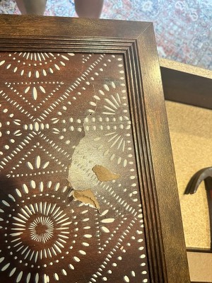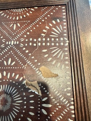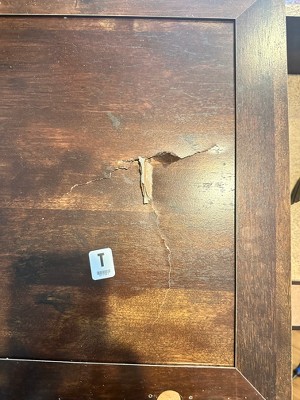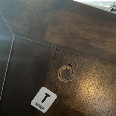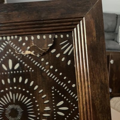 Received with small scratches on top, which exposed white. Cheaper material than expected for the price. The back piece is just a piece of cardboard you have to tack on. It is pretty and I like the dimensions.