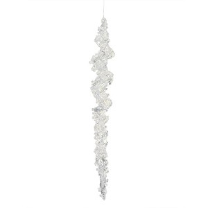 Vickerman 10" Clear Icicle with Silver Glitter Christmas Ornament. Create a winter wonderland with this elegant Icicle ornament. This sparkling Icicle ornament is made of durable acrylic and features crystal-like accents and a dusting of silver glitter. Includes 6 pieces per bag.
