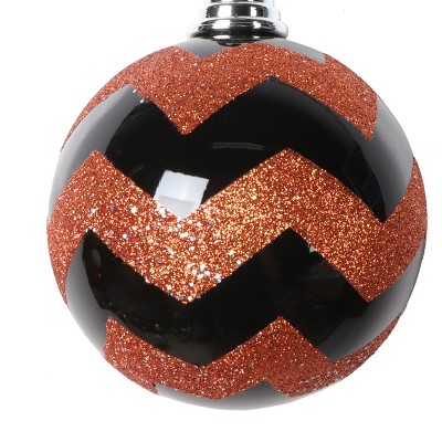 Vickerman Black and Orange Round Ornament. This ornament has a black enamel finish with orange chevron pattern. String hanger.