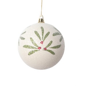 Vickerman 4" Holly Ball Ornament. It features a white ornament base with a glitter accented design. Sugar coated ornament. String hanger. Includes 3 pieces per bag.