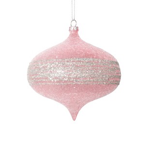 Vickerman 4" Onion Ornament. Light colored, Semi transparent ornament, with a stripe of champagne glitter. String hanger. Includes four pieces per bag.
