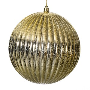 Vickerman 6" Shiny Lined Mercury Ball Ornament. Shiny mercury ball ornament with vertical lines and string hanger. Each ornament measures six inches. Includes four pieces per bag.