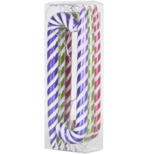 Vickerman Cane Christmas Ornament. This ornament set features a candy finish with glitter accented stripes, hanging strings are included. The ornaments are made of shatterproof plastic, and there are 6 ornaments per Box.