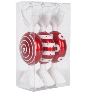 Vickerman Flat Candy Christmas Ornament. This ornament set features a candy finish with assorted glitter accented designs, hanging strings are included. The ornaments are made of shatterproof plastic, there are 3 assorted designs, and 3 ornaments per Box.