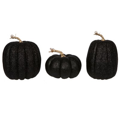 Vickerman 8" Black Pumpkins Set of 3. Three pieces assorted, Fabric pumpkin with polystyrene inner.