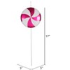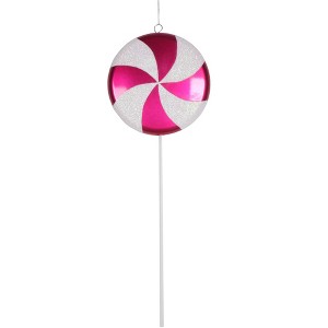 Vickerman Candy Lollipop Christmas Ornament. It features a candy finish with a glitter accented swirl design, a loop for easy hanging, and is made of shatterproof plastic.