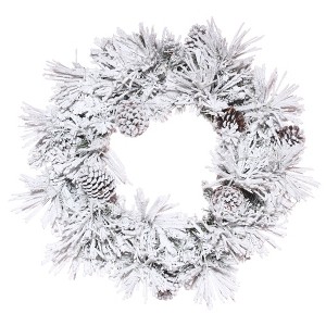 Vickerman Flocked Atka Artificial Christmas Wreath With PVC/Hardneedle tips. A great accent for your front door or mantle, this wreath features a beautifully flocked blend of PVC and Hardneedle tips with realistic pine cone accents.