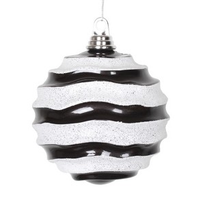 Vickerman Stripe Candy Finish Wave Ball Christmas Ornament. This ornament is made from shatterproof plastic and features a rich candy finish with a glitter accented, striped wave pattern, as well as a drilled and wired secure cap for reliable hanging.