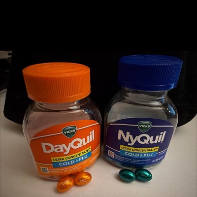 With the DayQuil and NyQuil Ultra Concentrated co-pack, you'll have the cold and flu multi-symptom relief you need on hand, day or night. Vicks DayQuil Ultra Concentrated Cold & Flu provides powerful, non-drowsy, daytime relief for your worst cold and flu symptoms. DayQuil relieves headache, fever, sore throat, minor aches & pains, nasal congestion, and cough. Contains acetaminophen. Now available in 25% smaller liquicaps compared to original DayQuil LIquicaps. Now available in an easy to open bottle. Vicks NyQuil Ultra Concentrated Cold & Flu provides powerful, Nighttime relief for your worst cold and flu symptoms. NyQuil relieves headache, fever, sore throat, minor aches & pains, nasal congestion, and cough. Contains acetaminophen. Now available in 25% smaller liquicaps compared to original NyQuil LIquicaps. Now available in an easy to open bottle.*Compared to Orginal DayQuil/NyQuil LiquicapsCompared to Original DayQuil/NyQuil blister packs