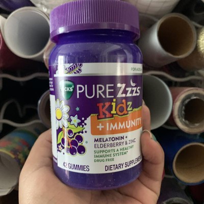 VICKS PURE Zzzs Kidz + Immunity is thoughtfully designed with your child in mind. They are specially designed with a low dose of melatonin to help your child fall asleep naturally + zinc to help support their immune system while they sleep*. This dietary supplement sleep aid works to support your child's natural sleep cycle and supports a healthy immune system*. These gummies contain Zinc, an essential mineral that provides immune system support.* VICKS PURE Zzzs Kidz + Immunity melatonin gummies are a great choice when your child is dealing with occasional sleeplessness and you are looking for a way to support their healthy immune system.* Our Vicks PURE Zzzs Kidz products are crafted with kids in mind and have a low dose of only 0.5 mg per gummy (1 mg melatonin per serving) to help with your child fall asleep naturally plus a complementary botanical blend of chamomile and lavender.*From the makers of ZzzQuil, the World's #1 Sleep Aid Brand!*These statements have not been evaluated by the Food and Drug Administration. This product is not intended to diagnose, treat, cure, or prevent any disease. Source Euromonitor International Limited; Consumer Health 2022 Edition; Sleep Aids, all channels, retail selling price, Global Brand Name ZzzQuil 2021 data
