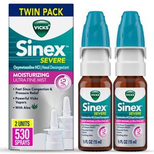 Breathe freely fast with Vicks Sinex Severe Moisturizing Ultra Fine Nasal Mist! Get instant relief from nasal congestion and sinus pressure that lasts 12 hours with Vicks Sinex Severe. This over-the-counter medicine relieves sinus pressure and nasal congestion by reducing swelling in the sinuses. This decongestant nasal spray targets congestion at the source with a powerful decongestant medicine called oxymetazoline. Sinex Severe Nasal Spray helps relieve sinus symptoms from allergies and colds. Vicks Sinex Severe works in seconds and lasts 12 hours. For adults and children 6 years and older (with adult supervision): 2 or 3 sprays in each nostril, not more often than every 10-12 hours. Do not exceed 2 doses in 24 hours. Not intended for daily use, read each label and use only as directed. Call your doctor if you suspect a sinus infection, sinusitis, or other more serious symptoms.