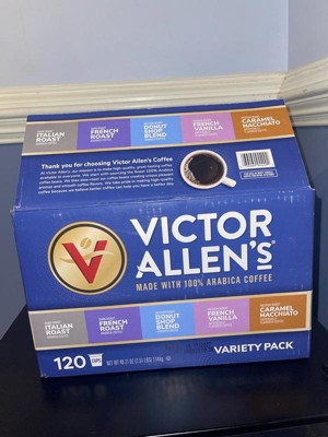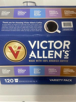 - Contains 1 box of 120 pods of Victor Allen's Coffee Single Serve Coffee Pod Variety Pack (Flavors Included: Donut Shop Blend, French Roast, Italian Roast, French Vanilla, Caramel Macchiato; 120 pods total)