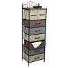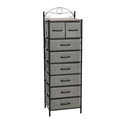 This Victorian Style 8-Drawer Tower Storage Organizer Unit features a black metal frame with scrolling Victorian detailing and a mid-century walnut wood grain top. It includes two medium drawers that measure 7.375 inches high, 7.875 inches long, and 12.25 inches wide, and six large drawers in 5.5 inches high, 15.75 inches long, and 12.25 inches wide, that can be rearranged to create various looks or uses. The top provides additional space for display or storage. Organize any items in style with this elegant and versatile storage unit that combines functionality with a touch of Victorian charm. Made of durable metal legs and frame paired with high-quality wood finished in scratch-resistant wood grain laminate, cloth drawers, and plastic handles, this unit measures 17.25 inches in length, 13 inches in width, and 54.0 inches in height.
