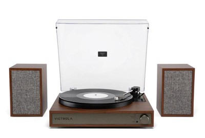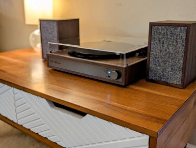 The Victrola Harmony turntable system blends classic mid-century design with premium stereo sound for a rich, immersive listening experience. Featuring a full-size, belt-driven turntable and matching stereo bookshelf speakers, the Harmony system delivers warm, detailed vinyl playback with deep bass and crisp highs. VINYLSTREAM™ Bluetooth output allows you to wirelessly stream your favorite records to Bluetooth speakers or headphones, while Bluetooth streaming, RCA output, and a 3.5mm aux input offer versatile options for connecting to external devices. The system is equipped with an Audio-Technica ATN3600L moving magnet cartridge, ensuring clear, precise sound reproduction across your vinyl collection. A removable full-size dust cover helps protect your turntable and records from dust and debris, preserving your setup for years to come. Whether you’re enjoying a classic album or streaming your latest playlist, the Harmony’s thoughtful design and modern features bring timeless style and outstanding performance to any space. Perfect for music lovers seeking a complete and stylish shelf system, the Victrola Harmony transforms any room into a true listening destination.