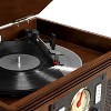- Features 3-speed turntable, Bluetooth connectivity, USB player, CD player, cassette player, FM radio with analog tuner, and 3.5mm aux-in