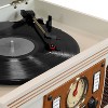 - Features 3-speed turntable, Bluetooth connectivity, USB player, CD player, cassette player, FM radio with analog tuner, and 3.5mm aux-in