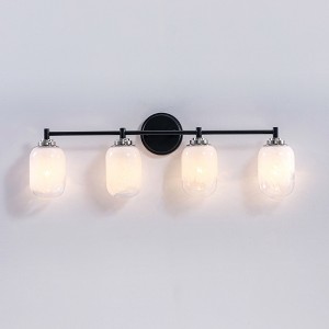 - Seren 4-Light Wall Sconce: The Seren Collection is a striking series of fixtures made with matte black steel lamp frames and handmade frosted glass lampshades. It includes a single light sconce, 4-light and 3-light sconces, a 9-light chandelier, and a 4-light pendant.