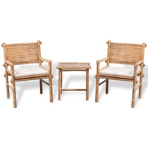 Enjoy outdoor relaxation with the vidaXL garden table and chair set. Made from eco-friendly bamboo, this set includes two chairs and a table, perfect for small spaces like balconies and patios. Removable seat cushions provide comfort, while the polished finish adds weather resistance. Assembly is required.