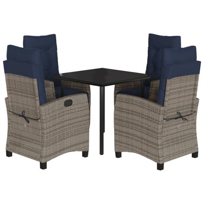 vidaXL 5-Piece Poly Rattan Outdoor Patio Dining Set - Adjustable Chairs, Tempered Glass Table Square, Navy Blue Cushions, Gray