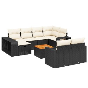 - Delivery Contains: 1 x Garden table, 1 x Footstool, 2 x Storage shelf, 1 x Corner seat, 4 x Center seat, 2 x Arm sofa, 8 x Back Cushion, 8 x Seat cushion with removable and washable cover