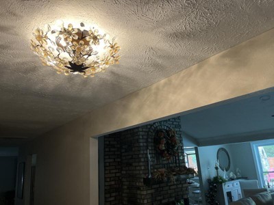 This ceiling hugger with clear, pale gold, pale cocoa colors of glass is so spectacularly beautiful. Rest of my new remodel is more masculine/ rustic so this is my bling. I have it in a dimmer switch and when turned on it reflects on the ceiling so elegant.