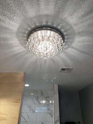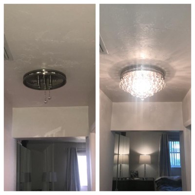 This ceiling light is very beautiful there is no doubt about that. This is why I’m giving it 4 stars but it should really be 3.5 stars. It is very bright. No lightbulbs come with the fixture so if you buy this light buy the lightbulbs ahead of time. It takes up to 40watt candelabra bulbs TYPE B. It works perfectly in the spaces i wanted them for. The crystals are real glass, and like with all ceiling lights of this style the crystals must be looped individually one by one after the light is hard wired and Mounted on the ceiling. Here’s where the real fun starts! The metal loops on the base of the light are TINY. Each metal loop attached to the crystals are very flimsy and tiny! They are similar to a key ring like the type you have in a key chain. You have to open the tiny flimsy metal circle, keep it open, and inserted through the tiny metal loop in the base. The first one took us, my husband and i, half a day to install and to insert each and every crystal string. I feel that the metal rings could be sturdier. One of them got stretched out as we were trying desperately to insert it on the base. Some crystal strings had come apart in shipping so i had to rebuild them. Similar to jewelry making. Make sure you have tweezers and needle nose pliers in the house. You should also have a very kind patient friend husband wife boyfriend significant other or relative to help you with this task. Patience is the key. I feel that for this price they should be better made. They are pretty and they are bright. Each lamp takes 6 bulbs so buy plenty ahead of time. You could easily just use three or four bulbs in each light and it would still be pretty bright. GOOD LUCK if you get it!
