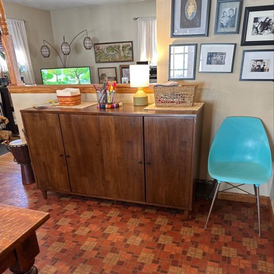 This solid rubber wood buffet is beautiful-BUT-it’s not usable because the doors are defective and will not go on properly. No matter the amount of adjusting and switching doors-huge gap where you can see in and wonky doors that are so uneven and cannot be adjusted properly. Screws falling out of the wood. So disappointed with this piece of furniture, especially for how expensive it was. I asked for a refund or replacement and was denied one because I missed the return window as this was a Christmas gift. Wasn’t expecting this furniture to be so low quality as we have always had great success with furniture purchases from Target. Also, not the great Target customer service I am accustomed to.