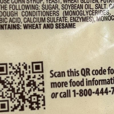 enriched unbleached flour (wheat flour, malted barley flour, niacin, reduced iron, thiamine mononitrate, riboflavin, folic acid), water, high fructose corn syrup, yeast, wheat gluten, potato flakes, contains less than 2% of the following: sugar, soybean oil, salt, calcium propionate (preservative), dough conditioners (monoglycerides, sodium stearoyl lactylate, ascorbic acid, calcium sulfate, enzymes), monocalcium phosphate, sesame flour.