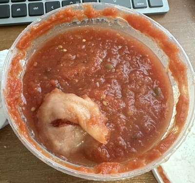 I usually like this salsa but the last two times I have purchased it, there have been issues. The last time it tasted carbonated. This time, it was leaking a little around the plastic seal and there was a strange looking mass on the top of the salsa. Might be a tomato or mold? Not sure. I’m not planning on trying it though!