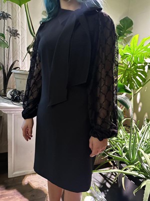[This review was collected as part of a promotion.] I received my Vince Camuto Signature Stretch Crepe Bow Neck Shift with flock mesh sleeves in the color black and it's a size four! I love how perfect it fit! The sleeves are so beautiful! The material is so comfortable!