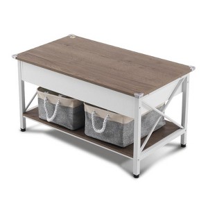 This coffee table features a clever flip-up design that allows you to easily work, browse, or dine on your sofa. It combines a brown panel with a stylish white frame, bringing an industrial style to your living space. The open shelves provide ample space to display your favorite books or board games, while the hidden compartments neatly store your essentials. The X-shaped crossbar adds a touch of personality to the room. Additionally, the veneer is very easy to clean, simply wipe it with a damp cloth.